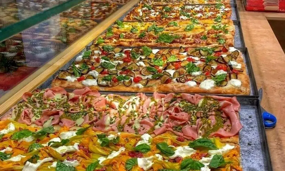 Если жареная пицца — это праздник вкуса, то pizza al taglio — настоящая «рабочая лошадка» уличной еды. Её можно найти в любой ростичерии или пекарне: большие противни с ароматной пиццей выставлены прямо на прилавке, и продавец ножом отрезает вам нужный кусок.